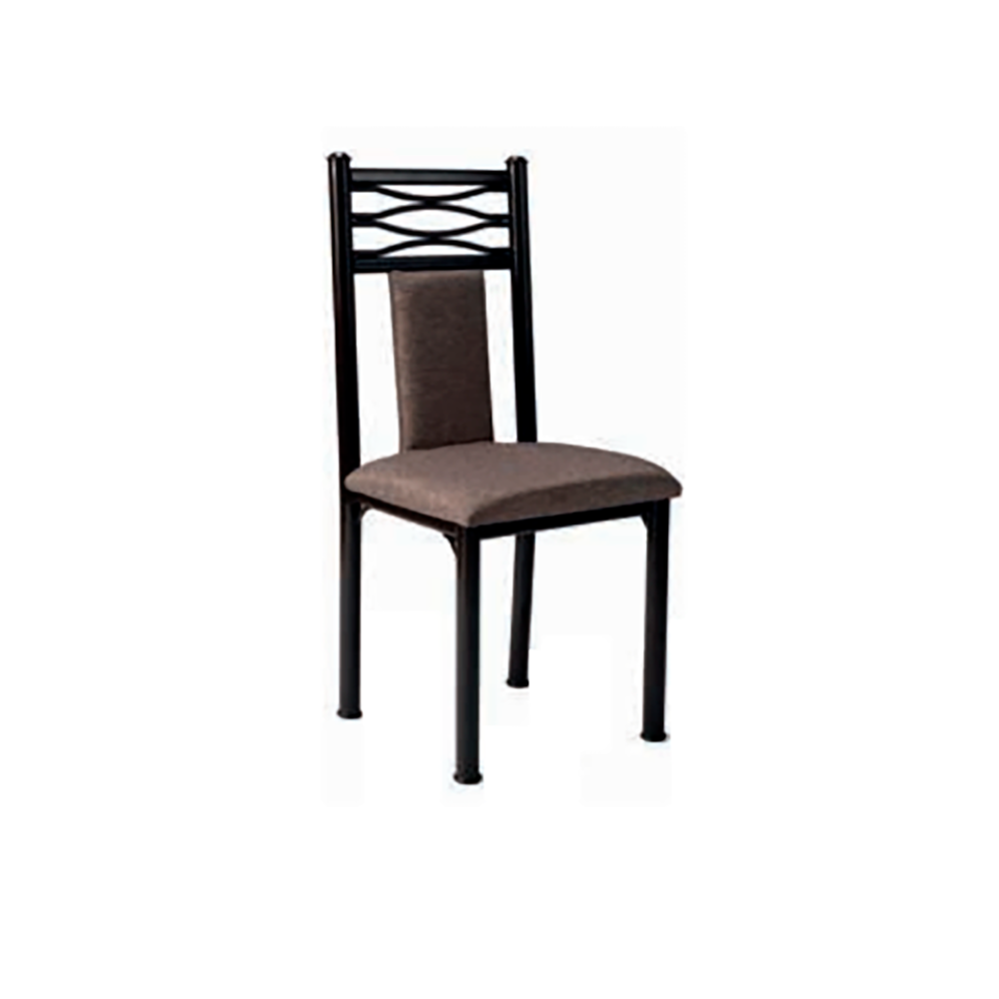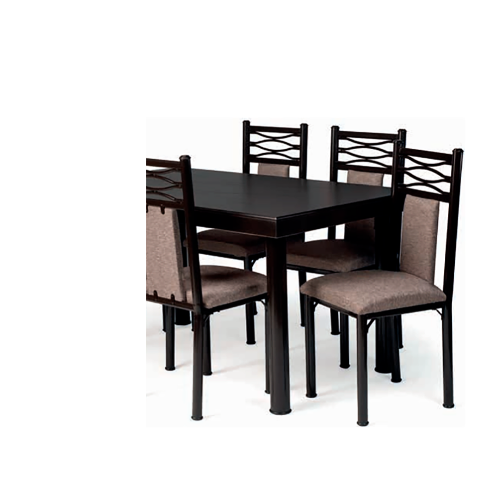 Las cuatro sillas que acompañan este conjunto destacan por su estructura firme y su diseño decorativo en el respaldo, creando un ambiente sofisticado y visualmente armonioso.