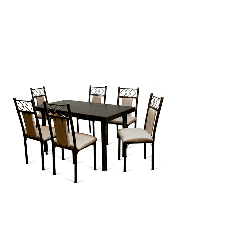 - Incluye 6 sillas con estructura metálica resistente, diseñadas para ofrecer estabilidad y durabilidad.