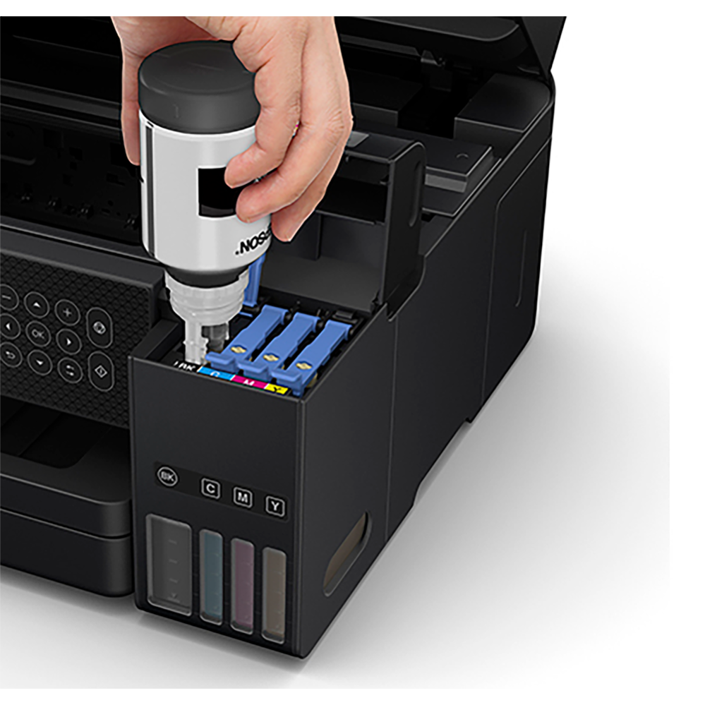 Ofrece alto rendimiento y gran eficiencia gracias a su sistema sin cartuchos, con tanques de tinta recargables y de bajo costo.