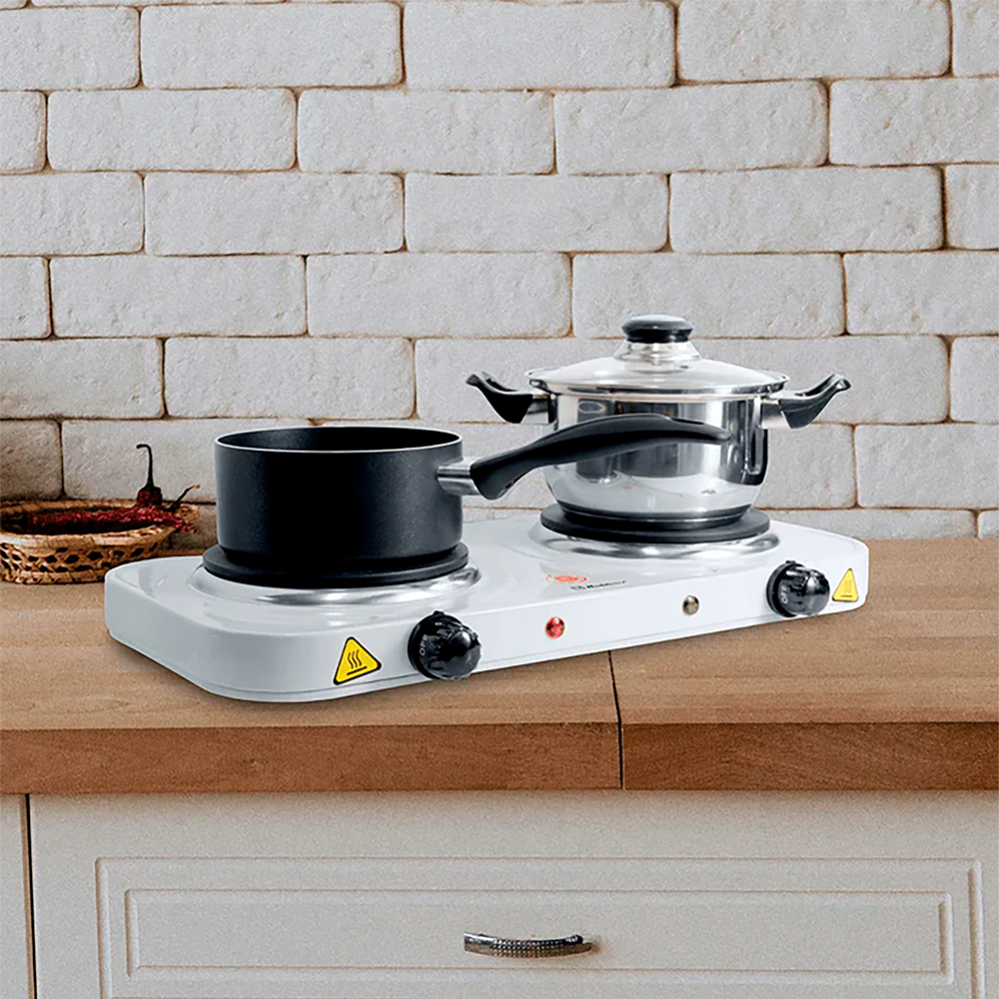 Los dos quemadores de hierro fundido aseguran que tus recipientes se apoyen firmemente; nada se tambalea, nada se desliza. Además, la limpieza se vuelve más sencilla porque la superficie es sólida y resistente.